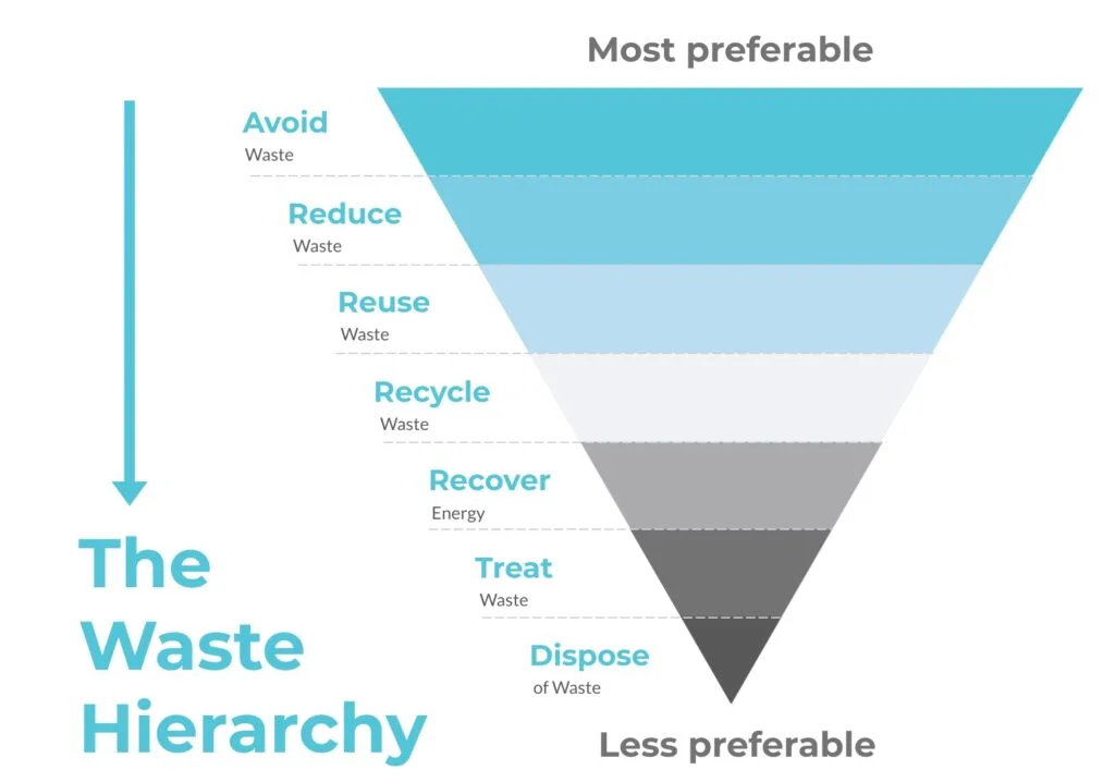 During demolition, it is important that the demolition process follows The Waste Hierarchy principle. Material repair and reuse are ideal in producing a closed-loop circular economy, whilst recycling or redistributing of used materials are also effective waste management methods.