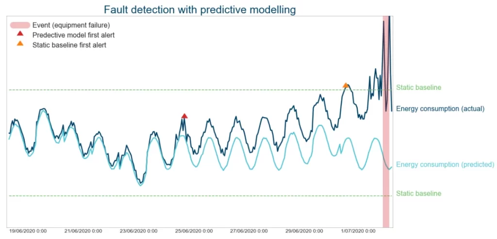Demonstrated in the example below, our predictive model rapidly identifies abnormal behaviour. The predictive model responds with an early warning on 24 June (the day in which the assets energy consumption begins to increase above its predicted rate). Comparatively, the static baseline approach only identifies the deviation on 30 June, once the energy consumption rate increases above the static threshold. This leaves only a two-day period for corrective action prior to equipment failure.